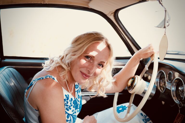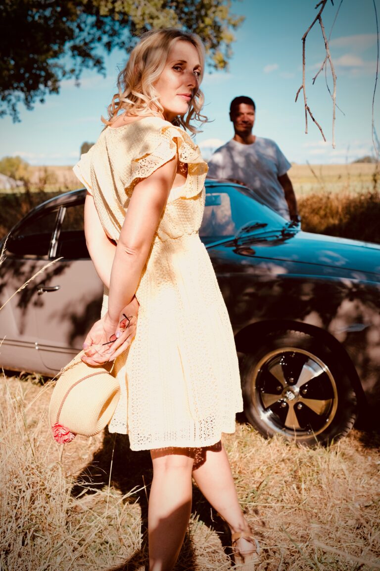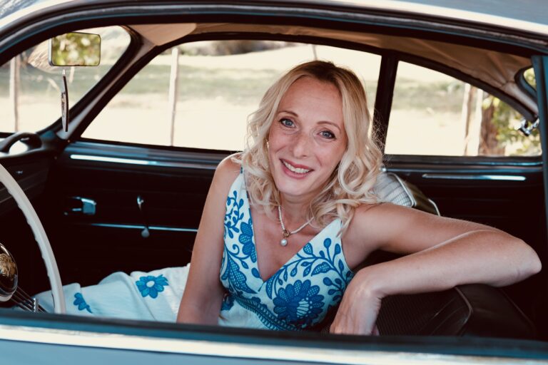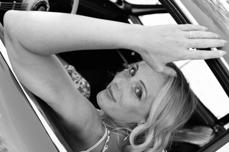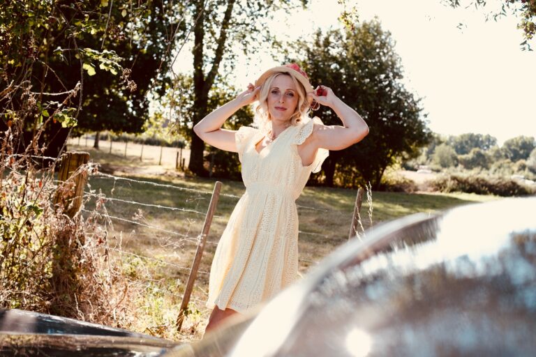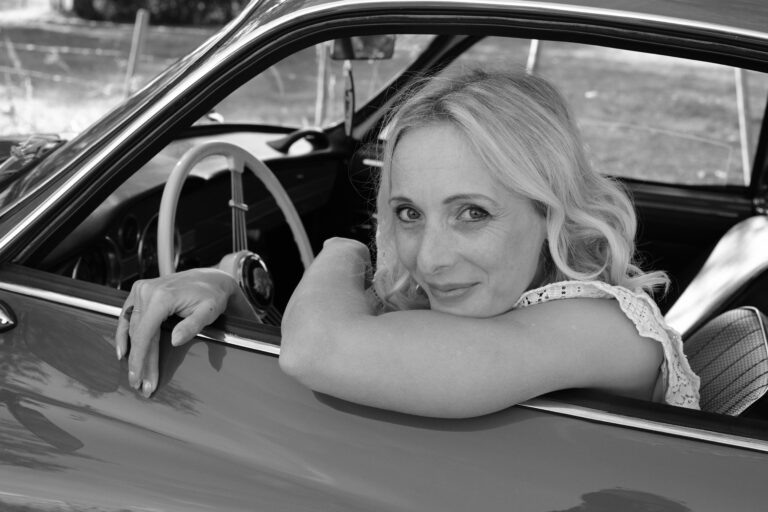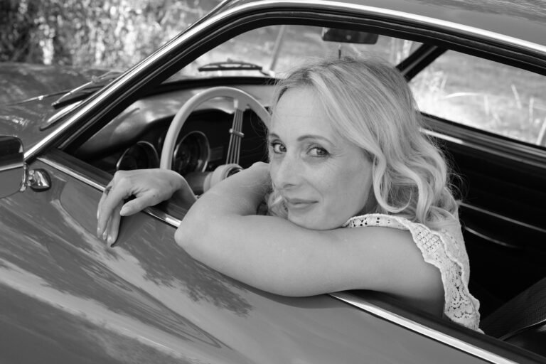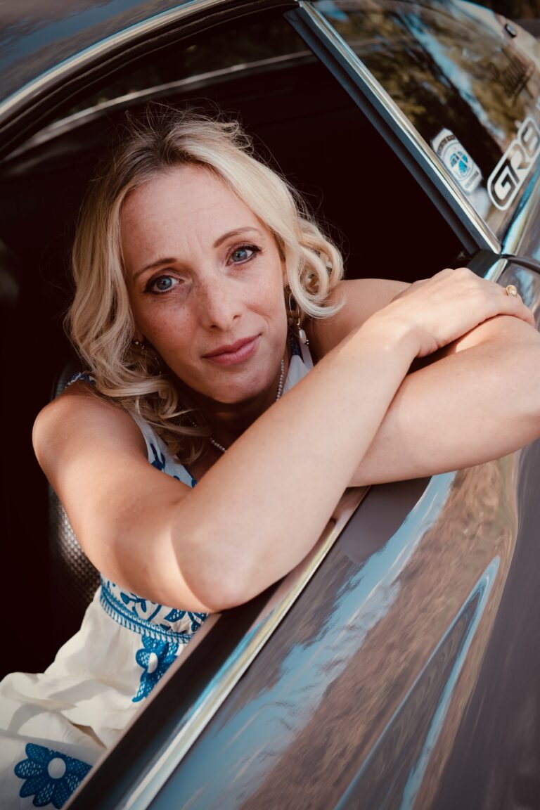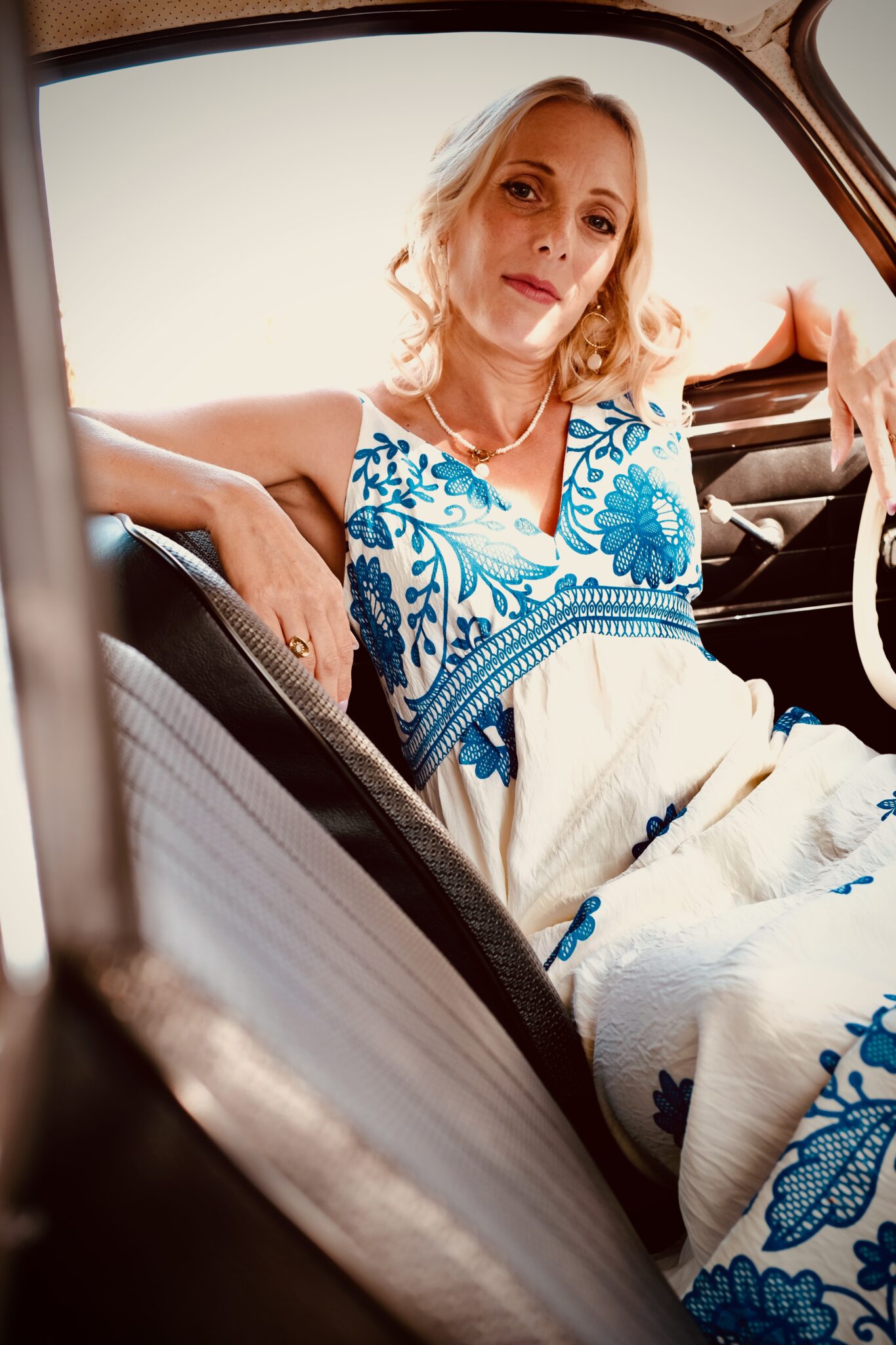 La vieille voiture brillait sous le soleil de fin d’été. Sur le siège avant, elle posait, élégante et mystérieuse, le regard fuyant comme si elle attendait un départ qui n’arriverait jamais. La lumière caressait son visage, mélange de douceur et de force, figée dans un instant qui ressemblait àn une scène dei film oublié.