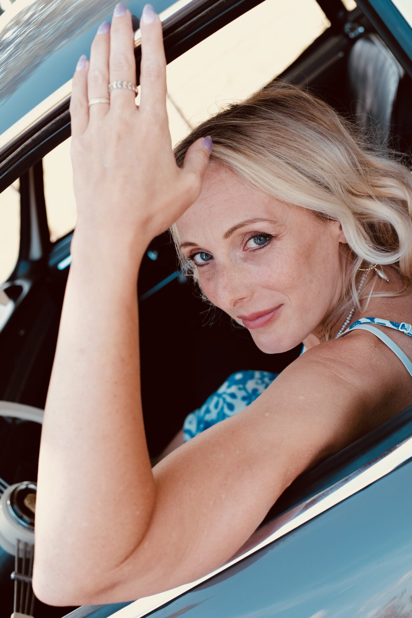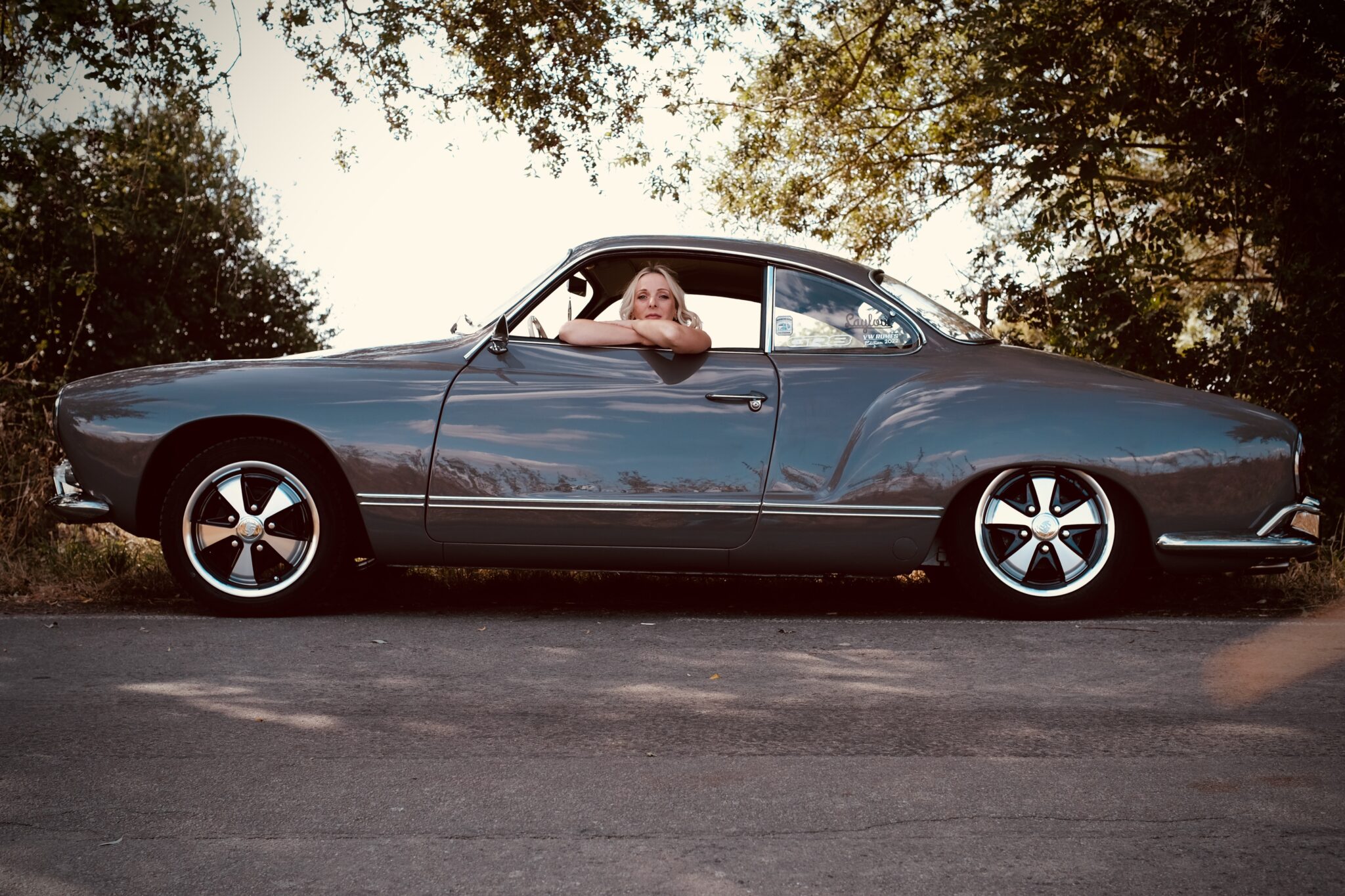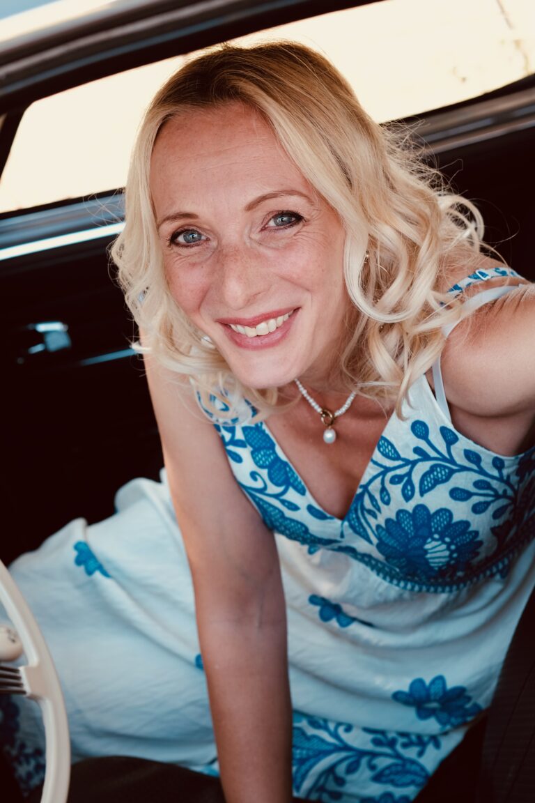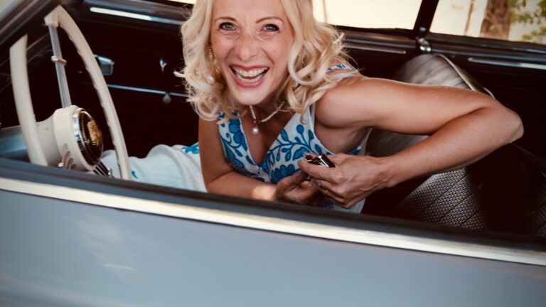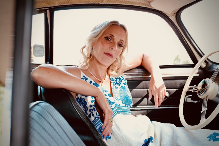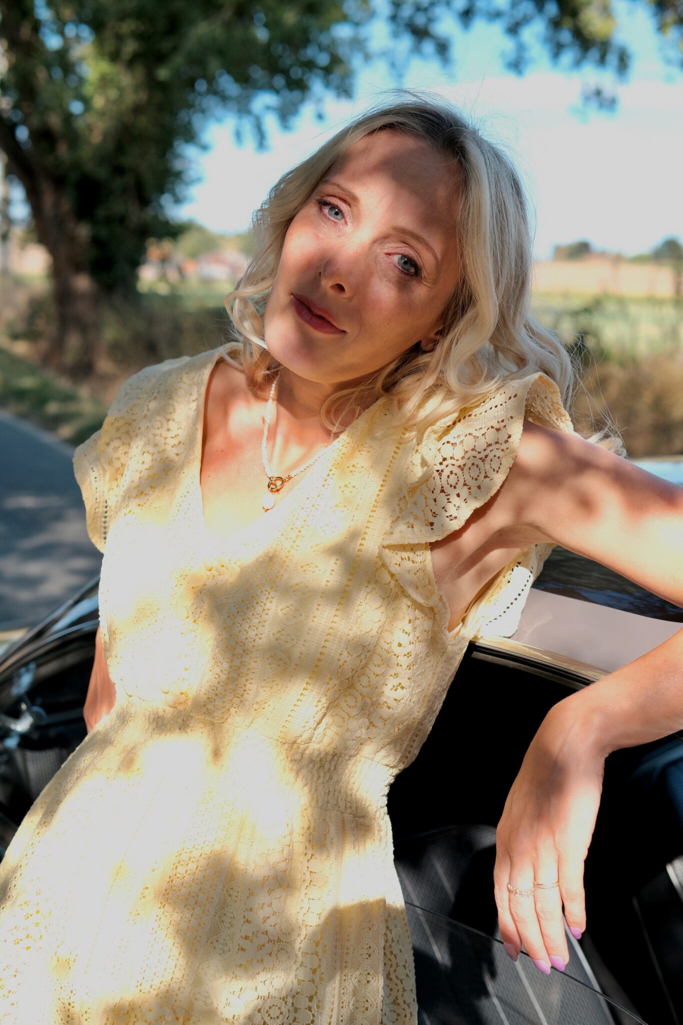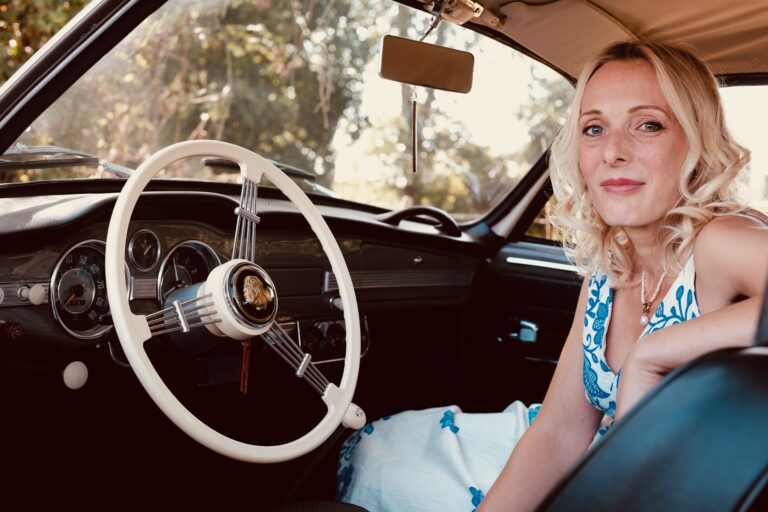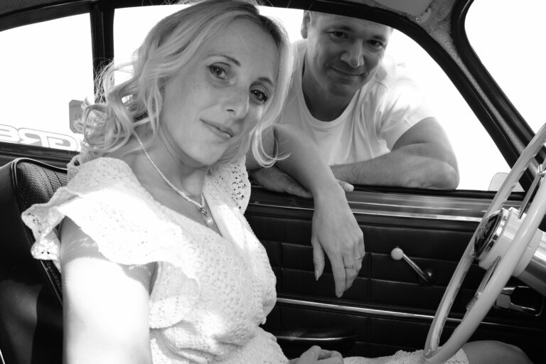 La vieille voiture brillait sous le soleil de fin d’été. Sur le siège avant, elle posait, élégante et mystérieuse, le regard fuyant comme si elle attendait un départ qui n’arriverait jamais. La lumière caressait son visage, mélange de douceur et de force, figée dans un instant qui ressemblait àn une scène dei film oublié.