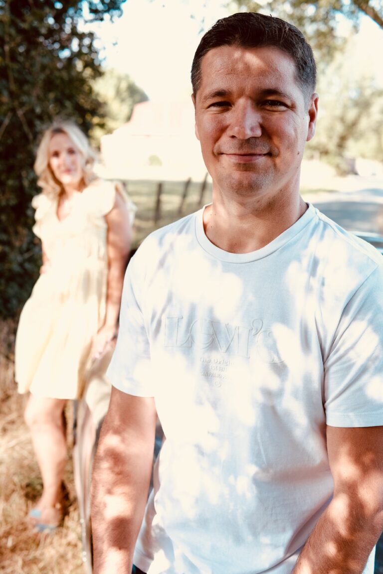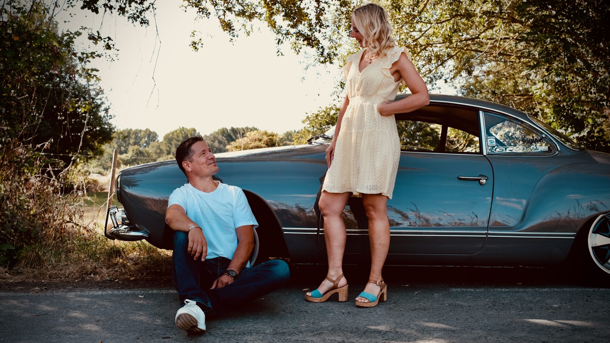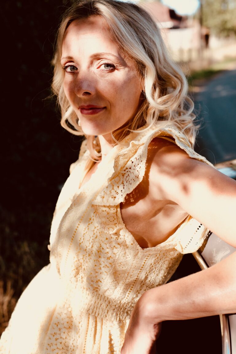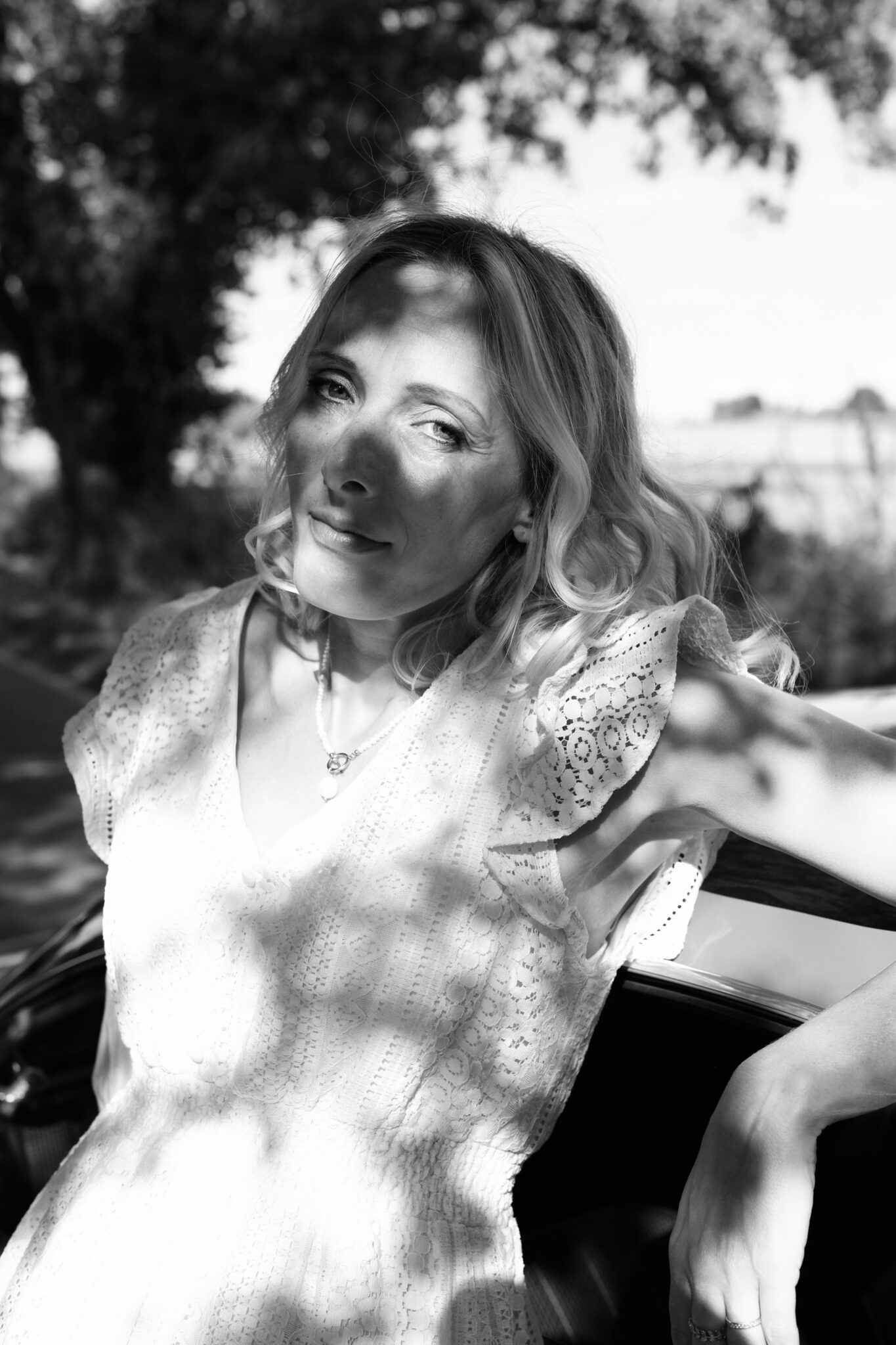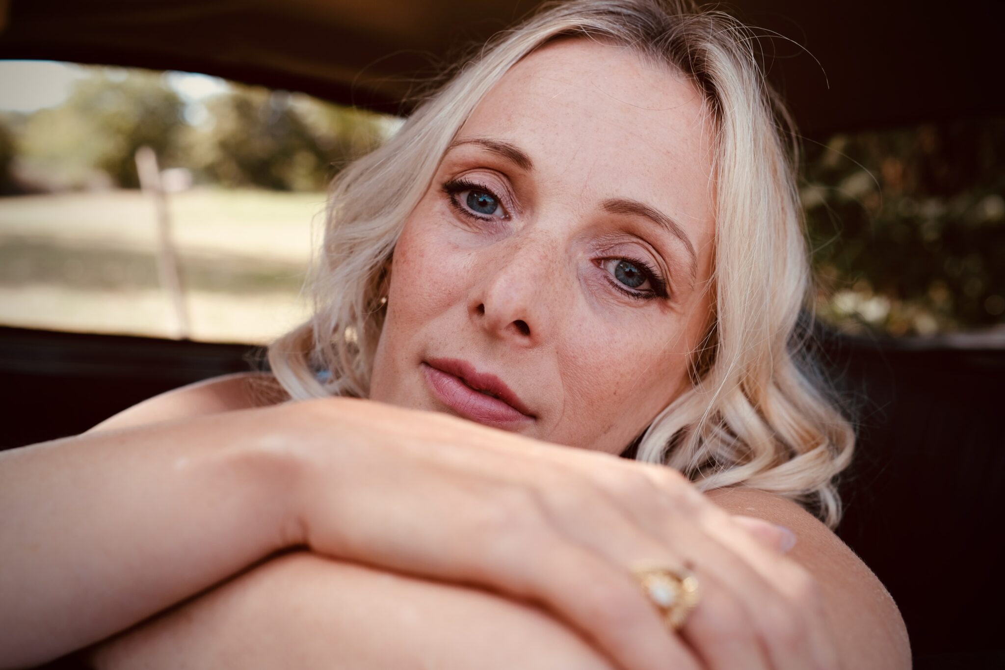 La vieille voiture brillait sous le soleil de fin d’été. Sur le siège avant, elle posait, élégante et mystérieuse, le regard fuyant comme si elle attendait un départ qui n’arriverait jamais. La lumière caressait son visage, mélange de douceur et de force, figée dans un instant qui ressemblait àn une scène dei film oublié.